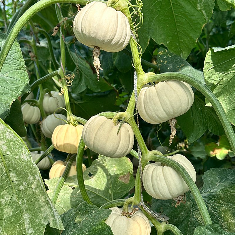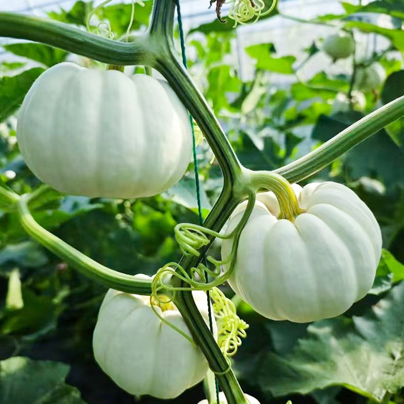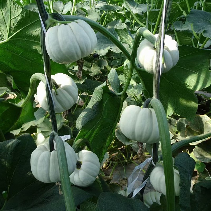 早熟迷你南瓜品種,授粉后45天左右成熟。植株長(zhǎng)蔓,分枝少,葉片中等。果實(shí)純白皮,扁圓形,單瓜重250g左右。果肉白色至乳黃色,粉糯香甜。較耐霜霉病,不易早衰,品質(zhì)好。食用兼觀賞,連續(xù)坐果性好,采收期較長(zhǎng)。